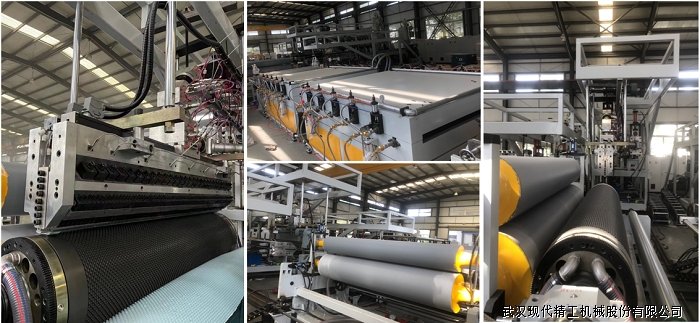 本生產(chǎn)線采用擠出法一次成型工藝, 以PP為主要原料,生產(chǎn)三層夾心板材,兩面為較薄的面層,中間為蜂窩的結(jié)構(gòu)可以分層單層板、雙層板。PP蜂窩板也可以一次成型雙面貼布、覆膜,具有重量輕、剛度好、環(huán)保減震耐寒、隔音保溫、防潮隔熱等優(yōu)點(diǎn)。