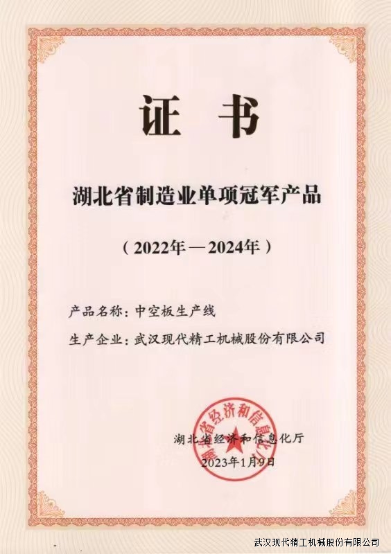 近日,在湖北省經(jīng)濟(jì)和信息化廳公示的2022年湖北省制造業(yè)單項(xiàng)冠軍企業(yè)(產(chǎn)品)名單里,武漢現(xiàn)代精工機(jī)械股份有限公司榜上有名,公司的中空板生產(chǎn)線通過了復(fù)核考驗(yàn),繼續(xù)享有湖北省制造業(yè)單項(xiàng)冠軍產(chǎn)品的稱號。